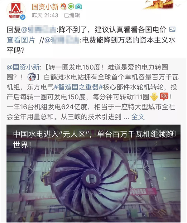 6月26日晚,小新在微博上發(fā)了一條題為“轉(zhuǎn)一圈發(fā)電150度!難道是愛(ài)的電力轉(zhuǎn)圈圈?!”的微博,說(shuō)的是白鶴灘水電站擁有全球首個(gè)單機(jī)容量百萬(wàn)千瓦機(jī)組,東方 電氣核心部件水輪機(jī)轉(zhuǎn)輪,投產(chǎn)后每轉(zhuǎn)一圈可發(fā)電150度,每分鐘可轉(zhuǎn)動(dòng)111圈,一年16臺(tái)機(jī)組發(fā)電624億度,相當(dāng)于一座特大型城市全社會(huì)全年用量總和。↓