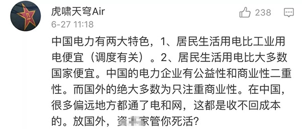 就在網(wǎng)友們紛紛留言點(diǎn)贊時(shí),一位網(wǎng)友在這條微博下留言稱,“電費(fèi)能降到萬(wàn)惡的資本主義水平嗎?”