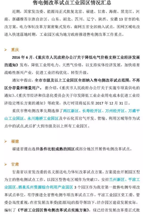 售電側(cè)改革試點(diǎn)工業(yè)園區(qū)情況匯總
