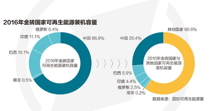 金磚國(guó)家占全球可再生能源比重不斷增加,也展示了其發(fā)展可再生能源的決心。根據(jù)國(guó)際可再生能源署的數(shù)據(jù),2016年,金磚國(guó)家在全球可再生能源發(fā)電裝機(jī)容量中占39.4%,超過(guò)了五國(guó)在全球GDP所占比重(2015年占22.5%)。其中,中國(guó)居主導(dǎo)地位,占金磚國(guó)家可再生能源總裝機(jī)容量的2/3,巴西和印度的可再生能源發(fā)展強(qiáng)勁,分別占全球總裝機(jī)容量的5%左右。俄羅斯和南非占比與上述國(guó)家差距較大,但裝機(jī)容量也在不斷增加。