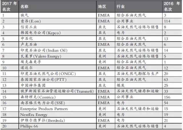 繼2016年的優(yōu)異表現(xiàn),亞太地區(qū)的能源公司今年繼續(xù)勢頭強(qiáng)勁,250強(qiáng)中占據(jù)88個(gè)席位。其中5強(qiáng)就占據(jù)半壁江山,10強(qiáng)中亞太地區(qū)和歐洲、中東和非洲(EMEA)各占據(jù)4席,美洲僅有兩席。