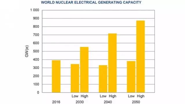 報告顯示,根據(jù)高估值,2030年的全球核電產(chǎn)能將在2016年水平上增長了42%,2040年將增長83%,到2050年將增長123%。另一方面,根據(jù)低估值,2030年的產(chǎn)能可能比2016年下降12%,到2040年下降15%,到2050年才會反彈至目前的水平。
