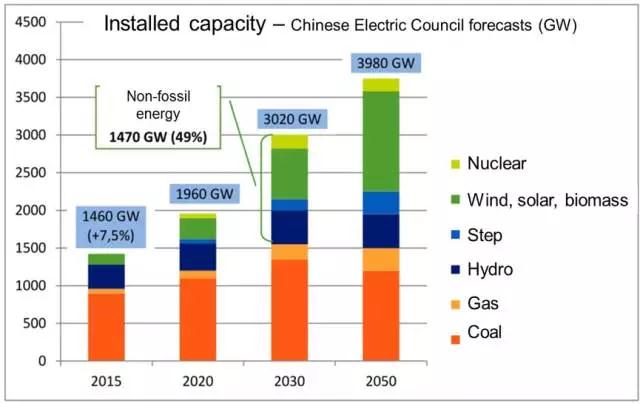 根據(jù)中電聯(lián)的發(fā)電裝機(jī)中長期預(yù)測,中國煤電裝機(jī)容量將在2030年達(dá)到峰值后逐步降低,至2030年,非化石能源發(fā)電裝機(jī)將占到總體的近一半。