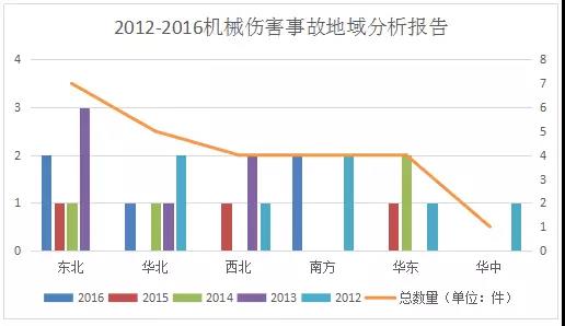 根據中電傳媒電力傳媒數據研發(fā)中心跟蹤數據顯示,2012~2016年間東北地區(qū)共發(fā)生機械傷害事故7起,為全國機械傷害事故數量最多的地區(qū)。