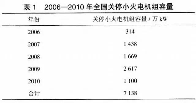 2002年,國家電力體制進(jìn)行改革,實(shí)行“廠網(wǎng)分開,競價上網(wǎng)”,撤銷國家電力公司,成立國家電網(wǎng)公司和南方電網(wǎng)公司,五大發(fā)電集團(tuán)及并四家電力輔業(yè)集團(tuán)公司。此次改革打破了電力縱向壟斷的局面,引入市場競爭機(jī)制。由于火電廠建設(shè)周期短、發(fā)電成本低、技術(shù)較成熟,火電廠建設(shè)成為各大發(fā)電集團(tuán)建設(shè)的重點(diǎn)。此次改革推動了火電產(chǎn)業(yè)的迅速發(fā)展,但是無序的火電建設(shè)也帶來了資源浪費(fèi)、環(huán)境污染等問題。“十一五”(2006--2010年)期間,國家提倡清潔高效地有序發(fā)展火電,2006--2010年,全國累計關(guān)停小火電7138萬kW,其具體情況如下表1所示: