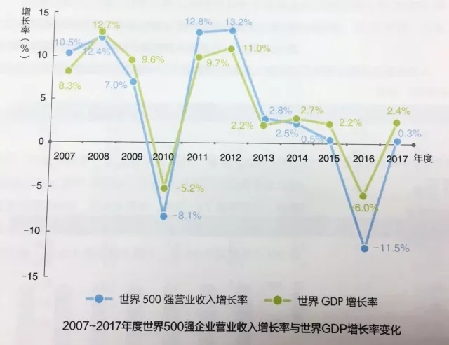 從總量上看,2007-2017十年間,世界500強企業(yè)營業(yè)收入總額從21萬億美元增長到28萬億美元,與世界GDP總額的比值始終穩(wěn)定在40%左右。