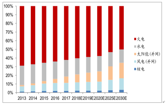 2013-2030年我國各類型電源發(fā)電量占比統(tǒng)計(jì)與預(yù)測