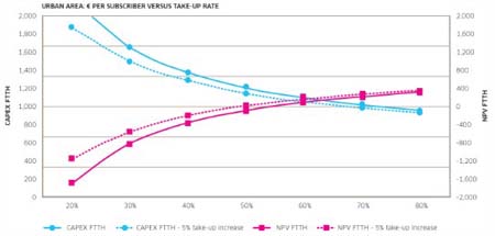 現(xiàn)已證明增加光纖的業(yè)務(wù)使用率可獲得很好的經(jīng)濟效益。根據(jù)阿爾卡特朗訊的研究,將光纖到戶(FTTH)用戶從20%增加到25% ,僅增加5%: