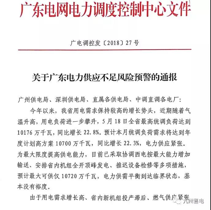 5月中旬以來,受南方持續(xù)高溫影響,廣東負荷快速攀升,同時南方主要水庫汛期來水滯后、廣東部分燃氣電廠燃氣供應(yīng)不足,導(dǎo)致廣東出現(xiàn)高峰、低谷電力供應(yīng)都十分緊張的局面。廣東電網(wǎng)電力調(diào)度控制中心已發(fā)布《關(guān)于廣東電力供應(yīng)不足風險預(yù)警的通報》,文件內(nèi)容如下。