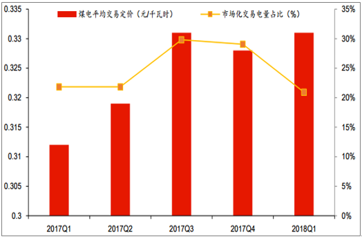 根據(jù)中電聯(lián)發(fā)布的2018年一季度全國(guó)電力市場(chǎng)交易信息披露,2018年1季度,我國(guó)煤電市場(chǎng)化交易平均電價(jià)為0.331元/千瓦時(shí),較2017年同期增加1.9分/千瓦時(shí),同比回升5.9%。