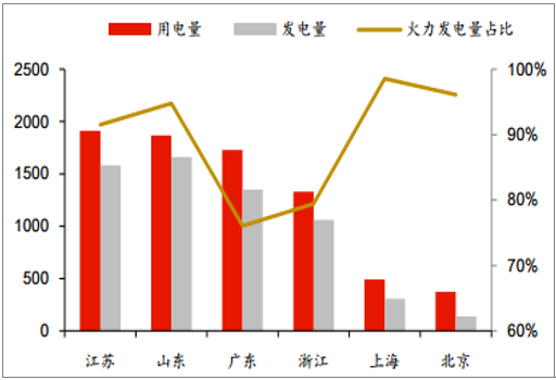 2018年1-4月,華東和華南用電量占全社會(huì)用電量比例分別為35%、11%,其中江蘇、山東、廣東、浙江用電量占比位居前列。這些用電需求旺盛的省份的用電量均明顯大于發(fā)電量,且省內(nèi)主要以火力發(fā)電為主。