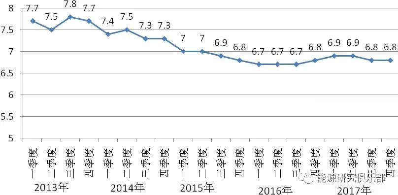 我國經(jīng)濟增速延續(xù)相對平緩走向,但每年仍以超過6.5%的速度增長,仍屬中高速增長。分季度看,2017年第一至四季度GDP增速分別為6.9%、6.9%、6.8%、6.8%,與前幾年相比增速曲線有所起伏。