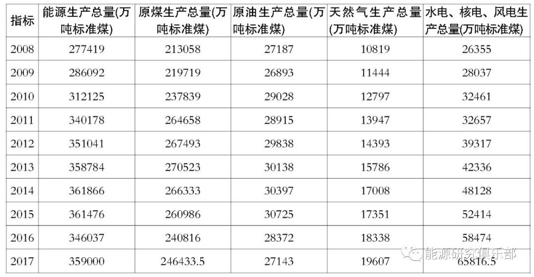從近十年能源生產(chǎn)數(shù)據(jù)看,能源生產(chǎn)總量經(jīng)歷持續(xù)增長后在2016年轉(zhuǎn)頭下降,2017年又開始上揚。2014至2016年原煤產(chǎn)量連年下降,2017年略有回升。原油產(chǎn)量繼2016年低于2億噸后,2017年再次降低。天然氣以及水電、核電、風電產(chǎn)量延續(xù)增長態(tài)勢,連年上升。