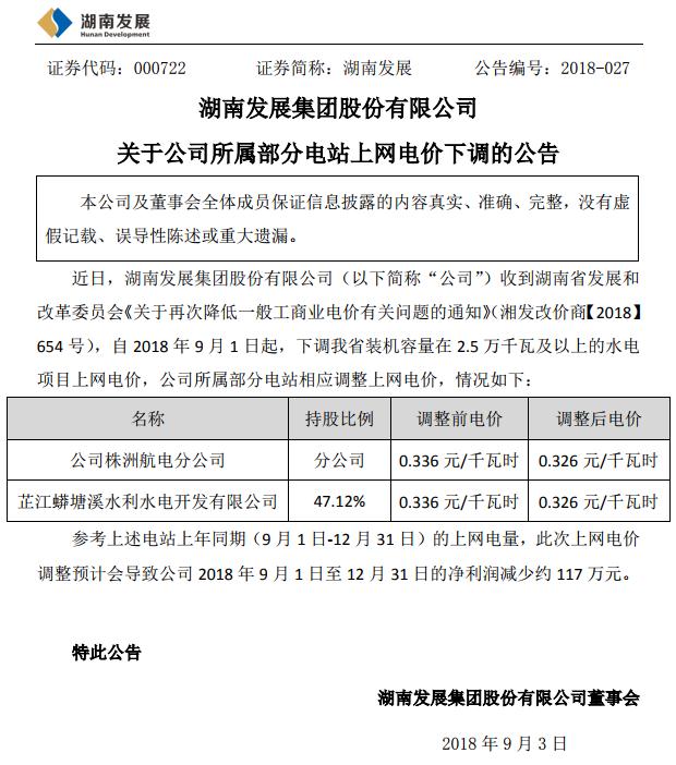 湖南發(fā)展集團股份有限公司(以下簡稱“公司”)發(fā)布公告稱:收到湖南省發(fā)展和改革委員會《關(guān)于再次降低一般工商業(yè)電價有關(guān)問題的通知》(湘發(fā)改價商【2018】 654 號),自 2018 年 9 月 1 日起,下調(diào)我省裝機容量在 2 5 萬千瓦及以上的水電項目上網(wǎng)電價。