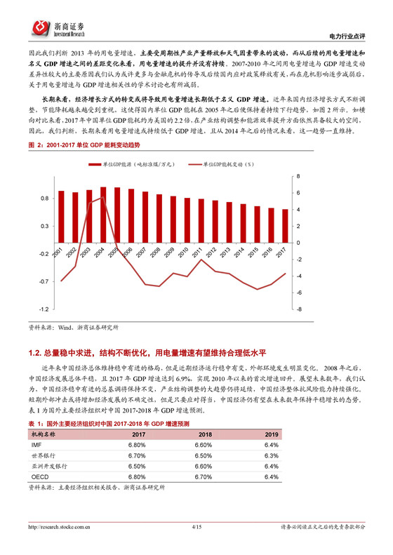 中長期來看,用電量增速與名義 GDP 增速存在較強的相關(guān)性,如果同時考慮國內(nèi)經(jīng)濟結(jié)構(gòu)轉(zhuǎn)型以及節(jié)能減排的持續(xù)推動,單位 GDP 能耗與電耗均有望保持平穩(wěn)下行。據(jù)此,我們預(yù)計,國內(nèi)用電量增速有望維持在 4-6%的中低速水平,基于此電力裝機總規(guī)模仍需適度控制。