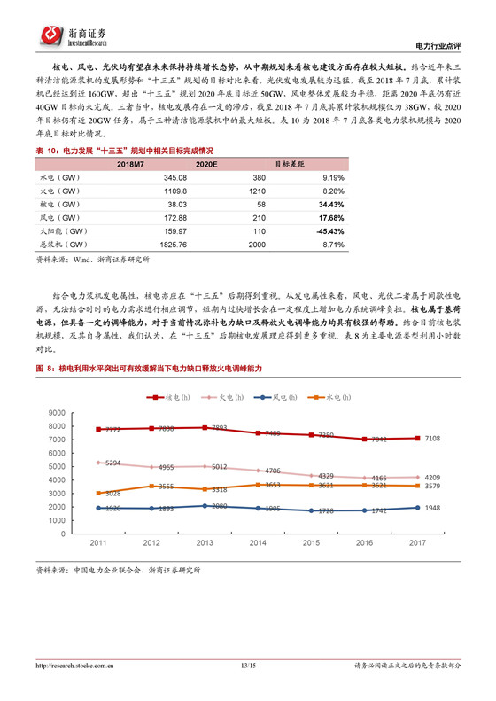 基于需求與供給的不同情境分析來看,樂觀需求與悲觀供給組合情況下的火電利用小時數(shù)較悲觀需求與樂觀供給情況下的火電利用小時數(shù)高出近 700h,基于電網(wǎng)安全與保證供給的角度來看,謹慎情境將是電力裝機增長規(guī)劃的約束條件,適當(dāng)提升裝機裕度,并輔以調(diào)峰補償是解決過剩與緊張并存問題的方法。從電力裝機清潔化趨勢、資源瓶頸限制以及潛在成本降低三個方面來看,核電、風(fēng)電、火電有望保持長期增長,其中核電建設(shè)規(guī)模較規(guī)劃差距最大,中期來看存在較大短板。