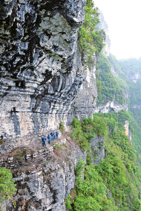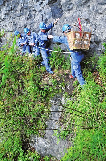 檢查情況良好,我們?cè)俅纬霭l(fā),前方拐彎處又見(jiàn)懸崖峭壁。巡線員用繩索拉起“護(hù)欄”,我們一手抓繩,一手扶壁,順利地通過(guò)了又一個(gè)險(xiǎn)境。