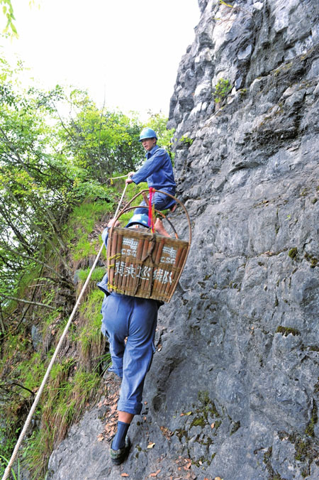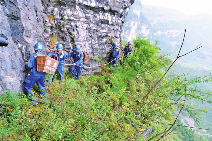 在懸崖上這樣的驚險(xiǎn)操作,卻是背夾巡線隊(duì)的日常。李暢 攝