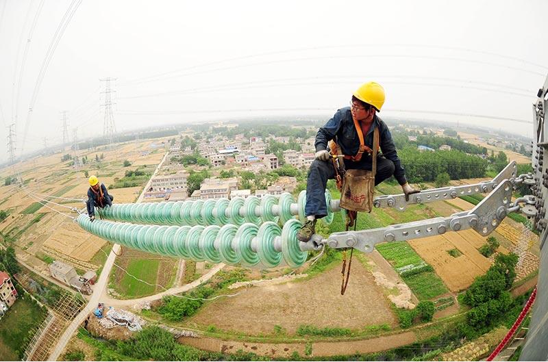 在安徽省淮南市洛河鎮(zhèn)境內(nèi),安徽送變電工程公司施工人員在70多米高空進(jìn)行500千伏輸電線路開(kāi)斷施工。