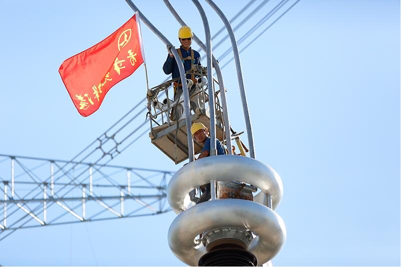 【背景】9月中上旬,在天津南1000千伏變電站施工現(xiàn)場,由安徽送變電電氣A包項目部組織成立的青年先鋒隊正在加緊施工,進(jìn)行設(shè)備引線安裝工作