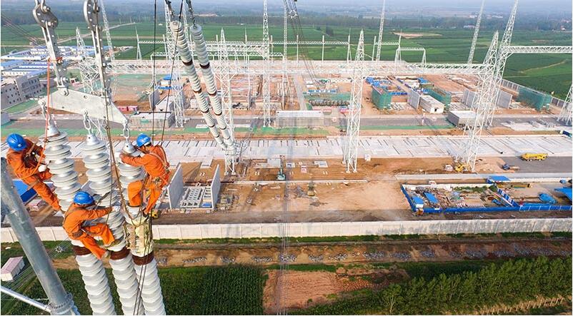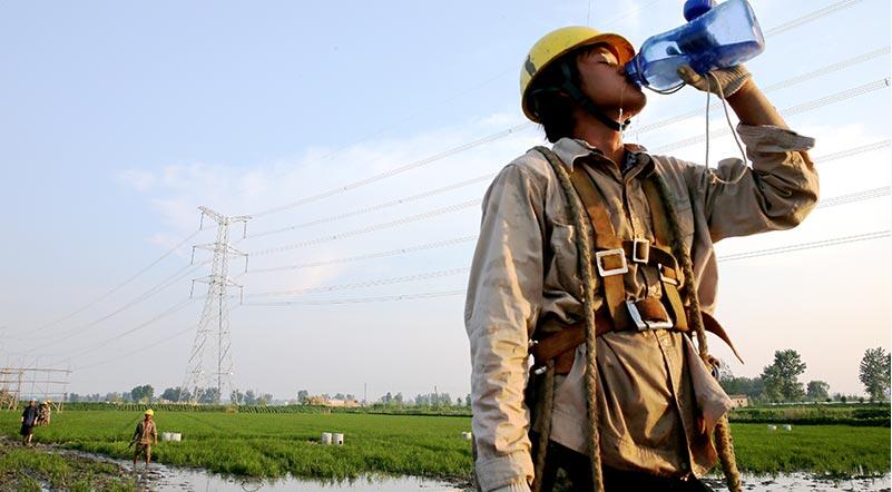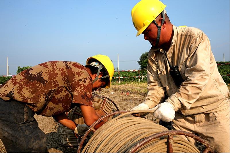 在特高壓建設(shè)現(xiàn)場(chǎng),施工人員頂著高溫,施工有條不紊地進(jìn)行。