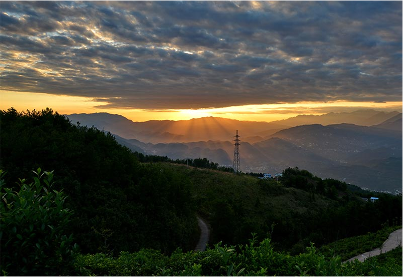 落日躲進云層,道道霞光鉆出云層射向綿延起伏的山巒,把天空縹緲的云朵、大地染得一片金黃,如夢如幻,令人陶醉。