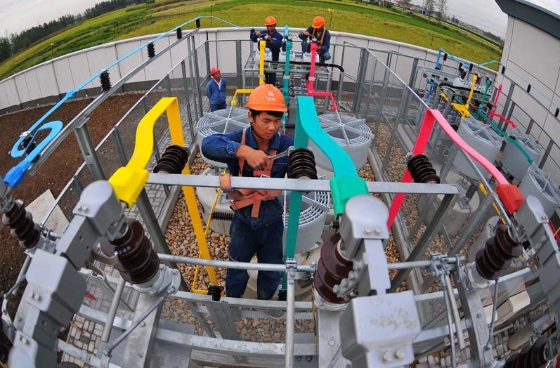 2013年9月28日,在安徽省滁州市定遠縣永康鎮(zhèn)光明村,電力工人在50多米的高空對輸電線路進行檢修,確保全市工農(nóng)業(yè)生產(chǎn)用電。當日,安徽省滁州市供電公司利用“國慶”節(jié)前部分企業(yè)放假、電力負荷較輕的有利時機,組織800多名技術人員對全市94條重要電力線路進行檢修,確保滁州電網(wǎng)安全穩(wěn)定運行,為“國慶”期間全市工農(nóng)業(yè)生產(chǎn)和城鄉(xiāng)居民秋冬季提供可靠供電。