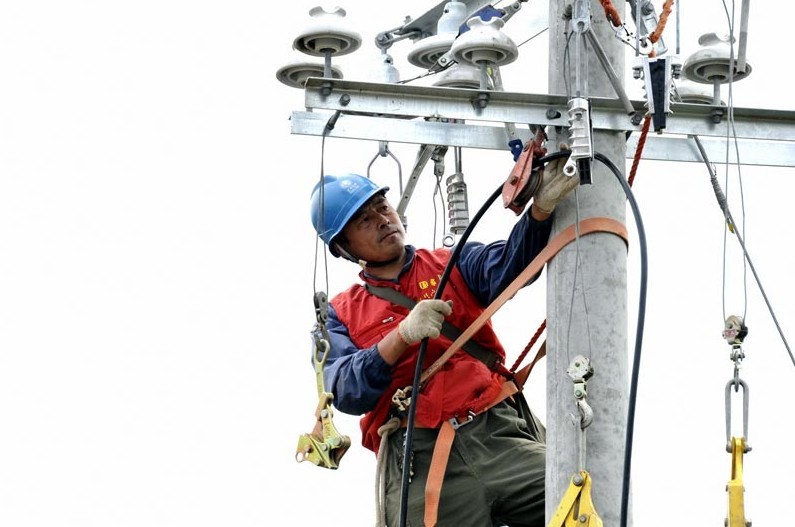 汗水不斷淌過黑紅憨厚的臉龐,擦了又淌;汗水不斷浸透藍(lán)色工裝,干了又濕透;汗水再次滲出國網(wǎng)標(biāo)志的安全帽,抹過再出;沉重的電纜越過堅(jiān)實(shí)的臂膀,延伸到電桿,到遠(yuǎn)方;高高的電桿、沉重的橫擔(dān),在秋老虎肆虐