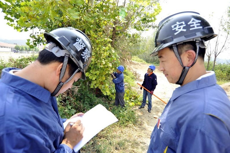 圖為:8月27日國網(wǎng)棲霞市供電公司安全督察人員在唐家泊供電所10千伏唐工線的清障線路走廊現(xiàn)場(chǎng)檢查安全作業(yè)情況。