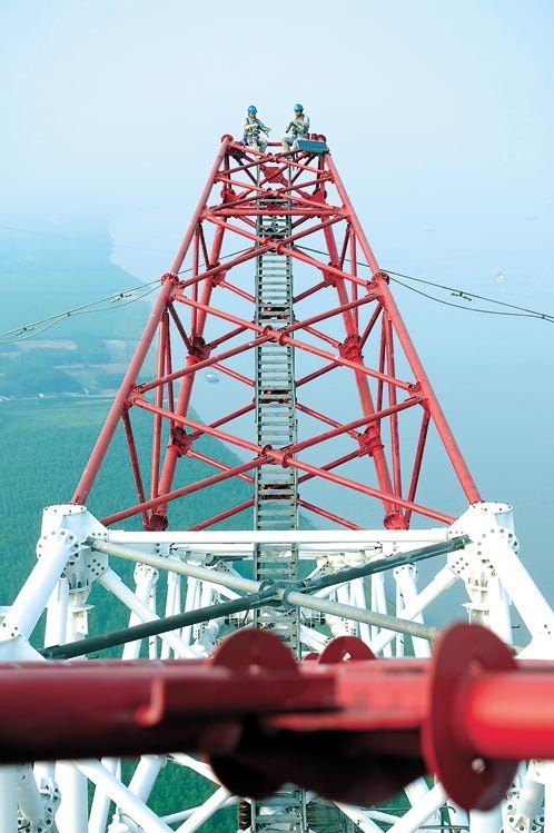 錦蘇線長江跨越高塔上更換航空障礙燈