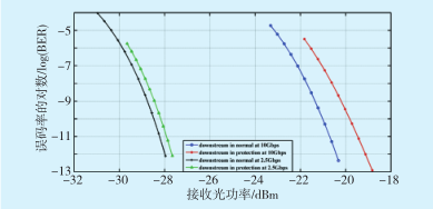 2種不同速率下的下行信號(hào)誤碼率(Bit-Error Rate,BER)曲線(xiàn)如圖8所示。在2.5 Gbps傳輸速率下,下行信號(hào)在正常與保護(hù)模式下有著非常近似的傳輸性能。當(dāng)誤碼率在10-9水平上時(shí),信號(hào)的接收功率需要大約-28.5 dBm。而由保護(hù)模式所產(chǎn)生的額外性能損耗要小于0.3 dBm。而在10 Gbps的傳輸速率下,正常與保護(hù)模式之間的傳輸性能差異擴(kuò)大到了1.2 dBm。而在誤碼率為10-9情況下,2種模式下行信號(hào)所需要的最小接收功率分別為