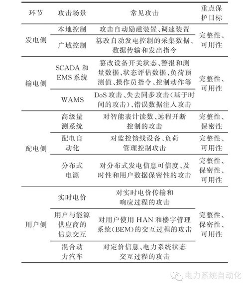 電力CPS系統(tǒng)中涉及網(wǎng)絡(luò)安全的典型應(yīng)用場合包括輸電操作、配電自動化、高級量測體系、需求響應(yīng)、用戶交互等。本節(jié)將結(jié)合以上應(yīng)用場合,按照電力系統(tǒng)發(fā)、輸、配、用戶側(cè)幾個環(huán)節(jié)展開,對可能存在網(wǎng)絡(luò)攻擊的具體場景進行總結(jié)歸納,如表4所示。