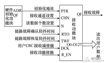 如圖7所示,接收側(cè),接收程序根據(jù)初始化地址讀出接收到的有效數(shù)據(jù)。接收側(cè)可根據(jù)具體需求和應(yīng)用程序配置情況靈活設(shè)置鏈路故障確認(rèn)防抖時(shí)間和鏈路故障恢復(fù)防抖時(shí)間,以實(shí)現(xiàn)穩(wěn)定可靠地檢測(cè)鏈路故障和故障恢復(fù),并實(shí)時(shí)指示鏈路工作狀態(tài);用戶CRC接收端使能置位的情況下,接收程序?qū)?duì)接收到的有效數(shù)據(jù)根據(jù)長(zhǎng)度進(jìn)行CRC計(jì)算,并與發(fā)送方的計(jì)算值進(jìn)行比較,比較的結(jié)果和硬件本身的CRC校驗(yàn)情況相或,任何一種CRC校驗(yàn)故障均會(huì)觸發(fā)CRC的故障指示。