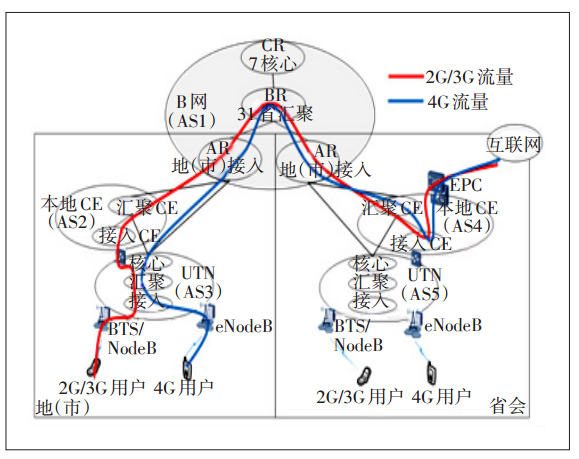 由于IPRAN、本地CE等網(wǎng)絡(luò)建設(shè)管理、維護分屬不同專業(yè)、不同部門,造成現(xiàn)有傳送承載網(wǎng)絡(luò)結(jié)構(gòu)仍較為復(fù)雜,存在多張網(wǎng)并行的情況,使得移動回傳業(yè)務(wù)接入的層級較多,存在多跳轉(zhuǎn)接、跨域復(fù)雜互通、投資浪費等問題,承載效率低下。通過對單個3G/4G用戶流量流向的分析,如圖1所示,可以發(fā)現(xiàn)單條業(yè)務(wù)最多達(dá)到了10跳(IPRAN網(wǎng)絡(luò)3跳、本地CE網(wǎng)2跳、B網(wǎng)3跳、省會CE網(wǎng)絡(luò)2跳)、經(jīng)過了4個自治域,除了造成大量的背靠背端口資源浪費外,還帶來如下影響: