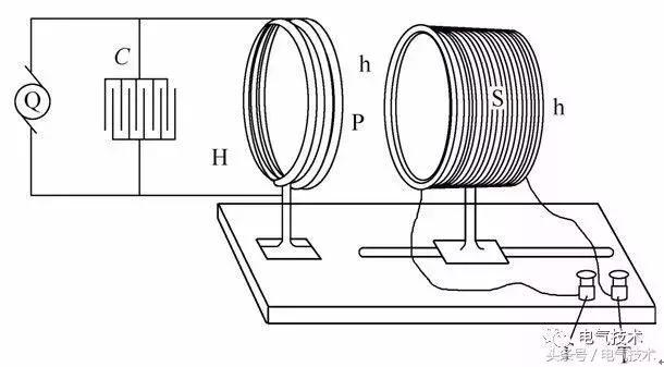 特斯拉提出無(wú)線電療裝置如圖2所示,發(fā)射線圈為一個(gè)直徑不小于3ft(大約90cm)的大鐵環(huán)H,鐵環(huán)上繞有幾匝粗大的電纜線P,兩端并聯(lián)一個(gè)由大面積極板形成的可變電容器,然后與電源相聯(lián);接收線圈為一普通漆包線繞制的線圈S,用兩個(gè)木箍h和硬紙板固定,連接到人體。該裝置工作時(shí),發(fā)射線圈與可變電容器在電源頻率下發(fā)生并聯(lián)諧振,流過(guò)發(fā)射線圈的諧振電流產(chǎn)生磁場(chǎng),耦合到接收線圈,轉(zhuǎn)換為電能對(duì)人體進(jìn)行電療。
