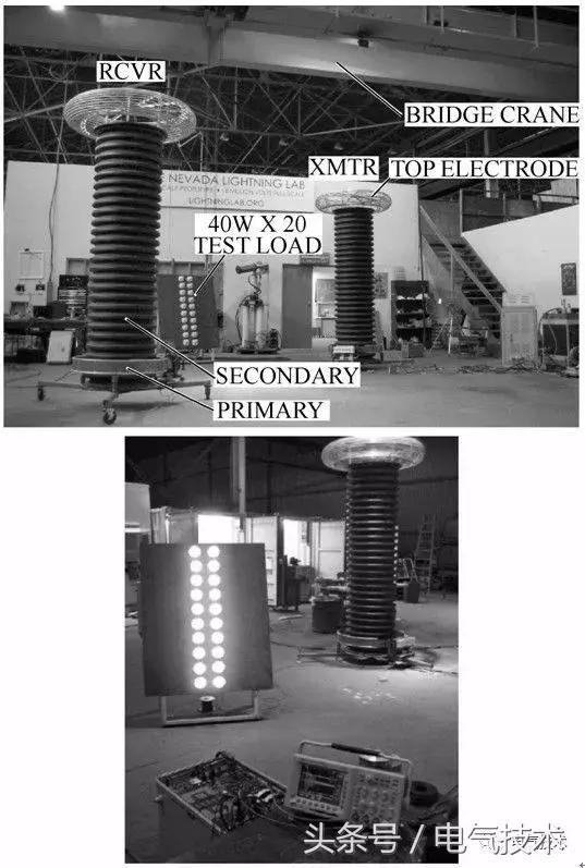 與磁諧振無(wú)線電能傳輸技術(shù)一樣,基于電場(chǎng)諧振的無(wú)線電能傳輸技術(shù)也得到了關(guān)注[83-85],但目前相關(guān)成果并不多,有代表性的是2008年美國(guó)內(nèi)華達(dá)州雷電實(shí)驗(yàn)室,研制成功了基于電場(chǎng)諧振的無(wú)線電能傳輸裝置,將775W的功率傳輸?shù)?m遠(yuǎn)的距離,效率達(dá)到22%[86],電場(chǎng)耦合無(wú)線電能傳輸裝置如圖6所示。