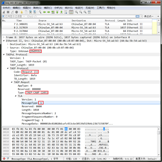 該分組封裝在Code=1(Request),Type=245(TAEP-CAAP),MessageType = 0x02的TAEP-Request-CAAP/TAEPoL中。