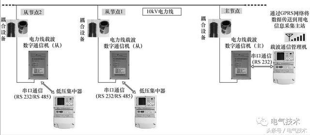 從載波機通過數(shù)據(jù)接口與從節(jié)點配電臺區(qū)處的集中器等終端設(shè)備相連,終端設(shè)備再通過低壓載波或RS 485總線等方式與該臺區(qū)內(nèi)的電能表相連。在主節(jié)點處,同樣需要使用一體化電容耦合器或卡接式電感耦合器與中壓配電線相連,并使用主載波機作為載波信號的收發(fā)和處理設(shè)備。主載波機再與配有GPRS/ CDMA無限通信模塊的載波通信管理機相連,最終實現(xiàn)與主站系統(tǒng)間的無線通信。