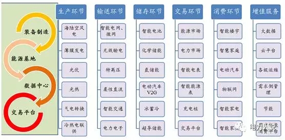 因能源結(jié)構(gòu)、能源市場化程度和用能技術(shù)等方面差異,不同國家實施能源互聯(lián)網(wǎng)的路徑和技術(shù)細節(jié)有所不同,但均涉及到如下圖所示的能源產(chǎn)業(yè)環(huán)節(jié):