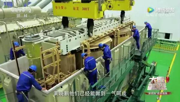 但是!我們聰明絕頂?shù)闹袊娏と藗兙涂梢蕴魬?zhàn)這項(xiàng)不可能!上面的人緊盯殼體不發(fā)生磕碰,下面的人確保器身凸點(diǎn)精準(zhǔn)對位。這個配合默契的團(tuán)隊(duì)已經(jīng)可以做到一氣呵成,器身吊裝入位僅需30分鐘!
