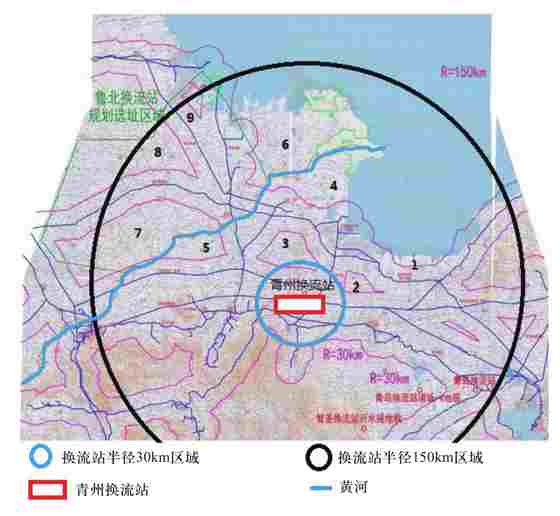 根據(jù)工程報告,在設(shè)計選址階段,相關(guān)設(shè)計單位以換流站為圓心,在30~150 km范圍內(nèi)對所有可能區(qū)域進行詳細收資,重點對鐵路及管線分布情況進行了篩查,最后鎖定9塊擬選區(qū)域,如圖1所示。對9個區(qū)域逐個進行分析,6、7、8、9區(qū)域位于黃河以北,為盡量避免接地極線路跨越黃河,降低工程造價,同時考慮遠期的換流站合理落點亦在黃河以北,故本工程的接地極優(yōu)先考慮黃河以南區(qū)域。