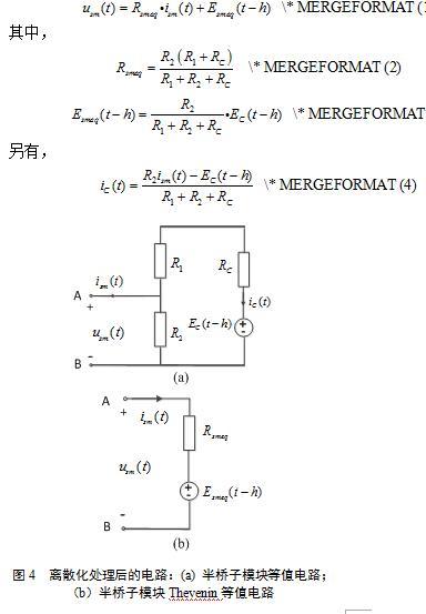 根據(jù)電容支路的Thevenin離散化伴隨模型,可以得到半橋子模塊的等值電路如圖4所示。其中R1、R2為上下IGBT&D開關(guān)的等值可變電阻。