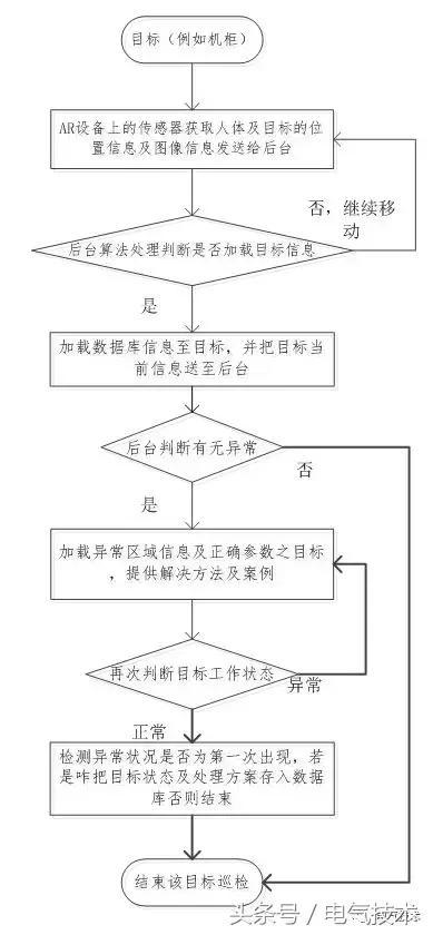 室內(nèi)定位系統(tǒng)通過攝像頭及藍(lán)牙設(shè)備獲取巡檢人員的位置信息和目標(biāo)的位置及圖像信息,后臺(tái)程序判斷是否對目標(biāo)進(jìn)行巡檢或信息加載,在有無異常的不同情況下進(jìn)行不同的處理,即加載維修方案及案例[[x]]或采集下一個(gè)目標(biāo)信息并建立案例庫直至結(jié)束巡檢。工作流程圖如圖3所示。