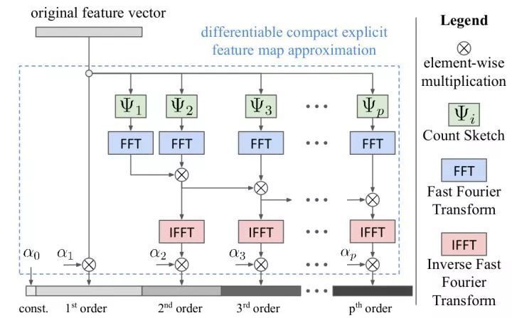 (2) 近似核估計。可以證明,在雙線性匯合結(jié)果后使用線性SVM分類等價于在描述向量間使用了多項式核。由于兩個向量外積的映射等于兩個向量分別映射之后再卷積,有研究工作使用隨機矩陣近似向量的映射。此外,通過近似核估計,我們可以捕獲超過二階的信息(如下圖)。