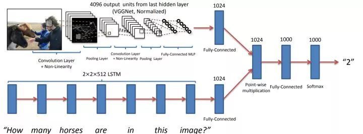 基本思路 使用CNN從圖像中提取圖像特征,用RNN從文字問題中提取文本特征,之后設(shè)法融合視覺和文本特征,最后通過全連接層進(jìn)行分類。該任務(wù)的關(guān)鍵是如何融合這兩個模態(tài)的特征。直接的融合方案是將視覺和文本特征拼成一個向量、或者讓視覺和文本特征向量逐元素相加或相乘。