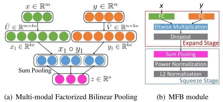 雙線性融合 通過視覺特征向量和文本特征向量的外積,可以捕獲這兩個模態(tài)特征各維之間的交互關(guān)系。為避免顯式計算高維雙線性匯合結(jié)果,細(xì)粒度識別中的精簡雙線性匯合思想也可用于視覺問答。例如,MFB采用了低秩近似思路,并同時使用了視覺和文本注意力機制。