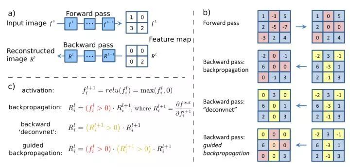 輸入顯著性圖 對給定輸入圖像,計算某一特定神經(jīng)元對輸入圖像的偏導(dǎo)數(shù)。其表達(dá)了輸入圖像不同像素對該神經(jīng)元響應(yīng)的影響,即輸入圖像的不同像素的變化會帶來怎樣的神經(jīng)元響應(yīng)值的變化。Guided backprop只反向傳播正的梯度值,即只關(guān)注對神經(jīng)元正向的影響,這會產(chǎn)生比標(biāo)準(zhǔn)反向傳播更好的可視化效果。