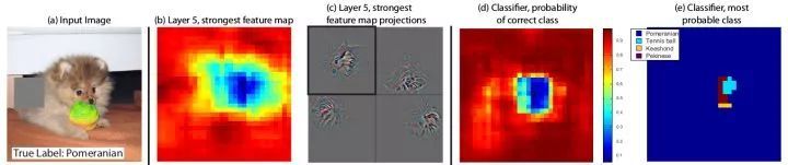 遮擋實驗(occlusion experiment) 用一個灰色方塊遮擋住圖像的不同區(qū)域,之后前饋網(wǎng)絡(luò),觀察其對輸出的影響。對輸出影響最大的區(qū)域即是對判斷該類別最重要的區(qū)域。從下圖可以看出,遮擋住狗的臉對結(jié)果影響最大。