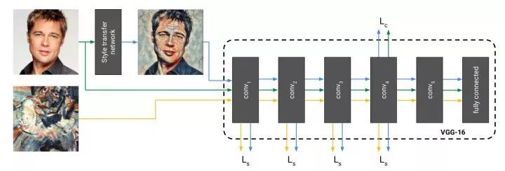 直接生成風(fēng)格遷移的圖像上述方法的缺點是需要多次迭代才能收斂。該工作提出的解決方案是訓(xùn)練一個神經(jīng)網(wǎng)絡(luò)來直接生成風(fēng)格遷移的圖像。一旦訓(xùn)練結(jié)束,進(jìn)行風(fēng)格遷移只需前饋網(wǎng)絡(luò)一次,十分高效。在訓(xùn)練時,將生成圖像、原始圖像、風(fēng)格圖像三者前饋一固定網(wǎng)絡(luò)以提取不同層特征用于計算損失函數(shù)。