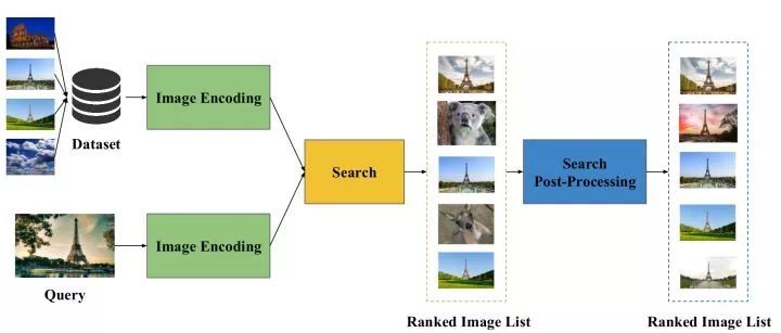 圖像檢索的典型流程首先,設(shè)法從圖像中提取一個合適的圖像的表示向量。其次,對這些表示向量用歐式距離或余弦距離進(jìn)行最近鄰搜索以找到相似的圖像。最后,可以使用一些后處理技術(shù)對檢索結(jié)果進(jìn)行微調(diào)??梢钥闯觯瑳Q定一個圖像檢索算法性能的關(guān)鍵在于提取的圖像表示的好壞。